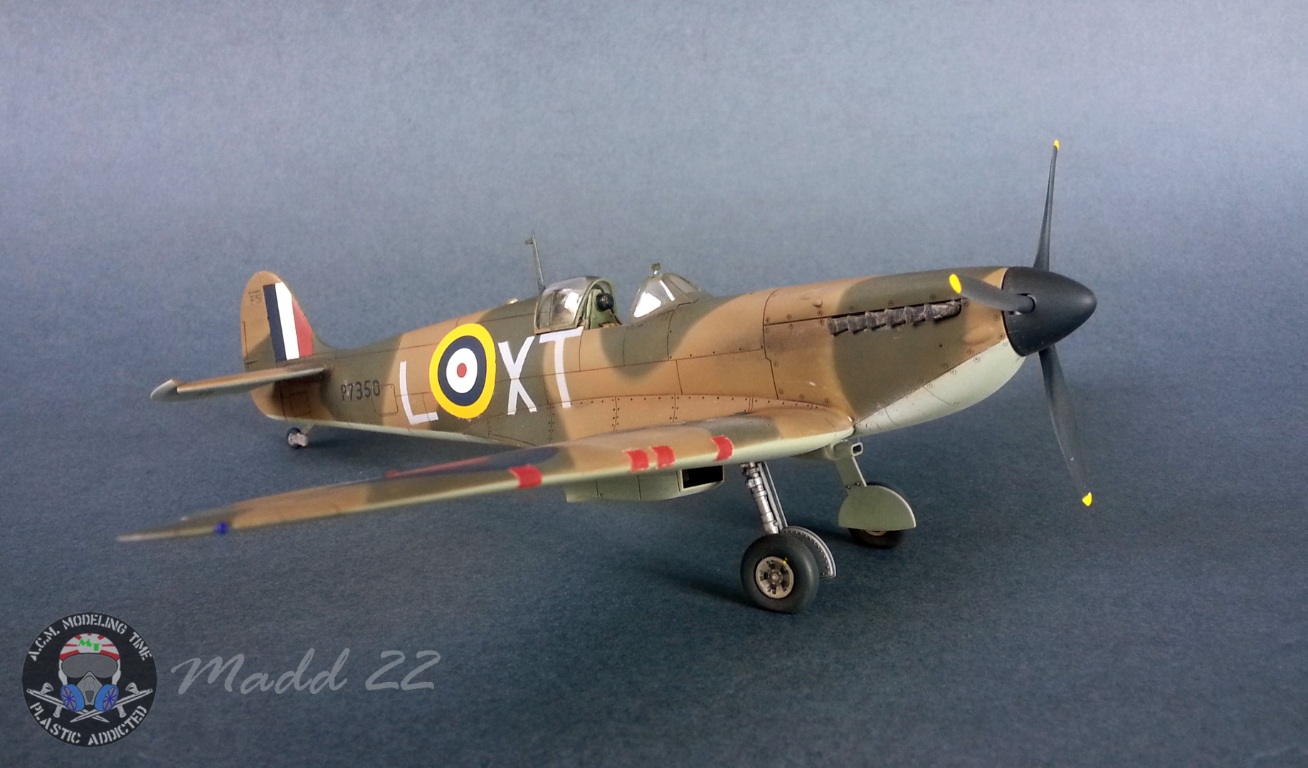Inizialmente considerai la realizzazione dello Spitfire semplicemente come un contorno all’Hawk, ma solo a lavori conclusi ho scoperto che il soggetto da me realizzato nascondeva molto di più sotto quella vernice. Infatti lo Spitfire Mk IIa P7350 è un vero e proprio veterano di guerra. E’ tutt’oggi il più vecchio Spitfire in condizione di volo al mondo e l’unico ad aver combattuto la Battaglia di Inghilterra.
