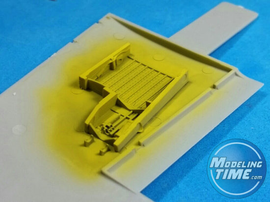 Montato il anche il vano aerofreno ho steso su tutto lo Zinc Chromate Tamiya XF-4 e mi sono dedicato all’assemblaggio delle semi ali partendo dai pozzetti carrello; questi sono veramente ben dettagliati ma i portelloni sono stranamente stampati solidali alle pareti della baia, soluzione che costringe il modellista a prestare molta attenzione per non danneggiarli. Lo stesso inconveniente si presenta anche sul pozzetto anteriore ma, in questo caso, ho preferito tagliare via le coperture e lavorarle a parte con maggiore tranquillità.