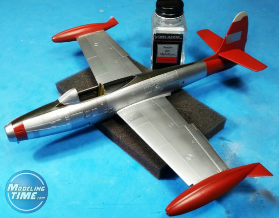 Ho poi realizzato la fascia antiriflesso in Olive Drab XF-62 Tamiya, i frames del canopy in Off White (Gunze H-21) ed il dielettrico sulla deriva in Aircraft Grey (Gunze H-57), ed infine ho sigillato tutto con il Sealer for Metalizers della Model Master (dopo aver provato diversi trasparenti credo che questo sia l’unico prodotto che mantiene inalterata la tonalità e la lucentezza dei metalizer).