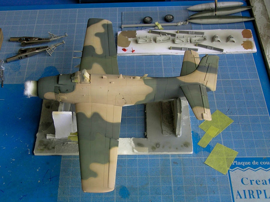 Avendo già in casa un verde e dei color sabbia, mi sono preparato da solo il SEA camouflage. Non mi andava di comperare dei colori apposta che magari avrei usato una volta sola. Così con prove e riprove ho ottenuto delle tonalità molto vicine, secondo me, ai colori originali; tenendo in considerazione che nelle foto che ho usato come riferimento non c’erano due aerei uguali, sia per l’età delle foto che per l’usura dei velivoli. In alcune immagini addirittura il color TAN appariva quasi grigio. Una curiosità : per quest’ultimo ho usato come base il rosa carne!