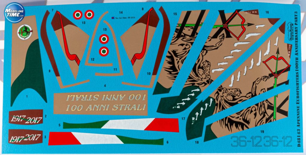 D72143 e D48143 – Part 3: il terzo foglio è dedicato al XII Gruppo ed è quello, a mio avviso, di livello qualitativo più basso. I fregi sono chiari e ben riprodotti, ma la scelta di riportare anche la mimetica (che riprende quella dello SPAD XIII di Baracca) è stata poco lungimirante dal punto di vista modellistico. I toni dei colori scelti appaiono troppo scuri (in particolare quello del marrone chiaro) e sul verde applicato sulla sommità della deriva si nota un contorno che circonda le sagome dei velivoli (probabilmente un refuso in fase di progettazione dell’artwork). Il testo applicato sulla dorsal spine dell’F-2000 reale recita “100 anni di Strali”, mentre sulla decal è stata omessa la preposizione “DI” facendo leggere solamente “100 anni Strali”.