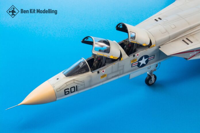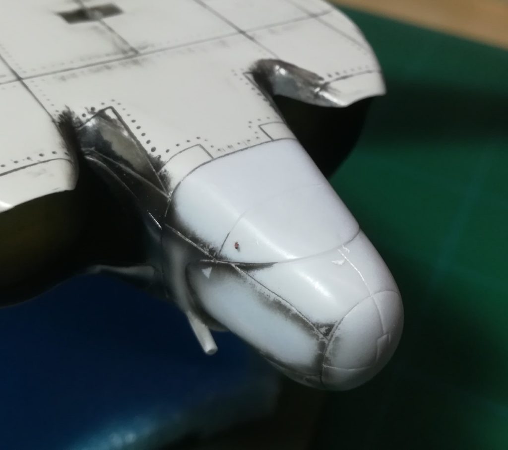 Studiando il radome poppiero ho notato che il pod delle ECM (Electronic Counter Measures) posteriore stampato sul pezzo della Cutting, e presente su tutti gli esemplari delle versioni aggiornate o di tarda produzione, non era quello montato sull’esemplare che volevo riprodurre. Stranamente il mio soggetto, pur avendo il Bu.No. (Buzz Number, numero di serie) delle versioni “late”, montava il vecchio tipo di sensore. Sinceramente se non avessi avuto delle foto di riferimento sarei andato avanti con l’apparecchiatura più aggiornata commettendo un grossolano errore, ad ennesima dimostrazione di quanto non bisogna dare per scontato un dettaglio anche quando tutta la documentazione cartacea codici e direttive tecnico-produttive sembrano inoppugnabili (una foto dell’esemplare che ho riprodotto è ben stampata a pagina 23 dell’Aerofax Minigraph n°9).