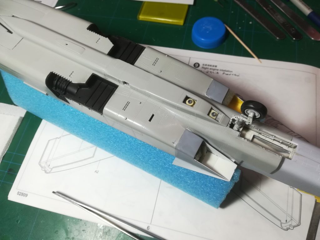 Terminati tutti gli interni, ho iniziato ad assemblare la fusoliera anteriore che, come previsto, ha lasciato diverse piccole fessure lungo le giunzioni; queste sono state stuccate con la colla ciano acrilica, in abbondanza. Durante questa fase, ho avuto la conferma del problema già indicato in altre recensioni, ovvero, la spiacevole tendenza a “chiudersi” verso l’interno della fusoliera posteriore. Fino a poco tempo fa la ditta Nautilus commercializzava un set di ordinate in legno che serviva a rinforzare tutta la parte posteriore e ridargli la giusta forma, permettendo oltretutto il corretto allineamento dei motori. Non avendola presa in considerazione all’inizio, ho provveduto a risolvere il problema in maniera più casalinga utilizzando una gomma piuma deformabile, che si trova in alcune confezioni di lampade: l’ho tagliato nella misura necessaria inserendola all’interno e, una volta adattata alla zona vuota, l’ho impregnata di colla ciano per renderla rigida e non più mobile. Effettivamente questa operazione dà al modello una certa solidità e soprattutto, meno effetto vuoto, quando lo si maneggia. Il pezzo che rappresenta il complesso degli scarichi l’ho stuccato e rifinito con l’aiuto dello stucco bi-componente Milliput. A proposito, i condotti dei due motori J79 in resina vanno incollati leggermente disassati verso l’esterno – essi non sono paralleli alla mezzeria del velivolo. Per la loro verniciatura ho scelto i metallizzati Alclad su una base nera satinata e un lavaggio con i colori a olio, per dar loro quel tocco di realismo e usura in più.