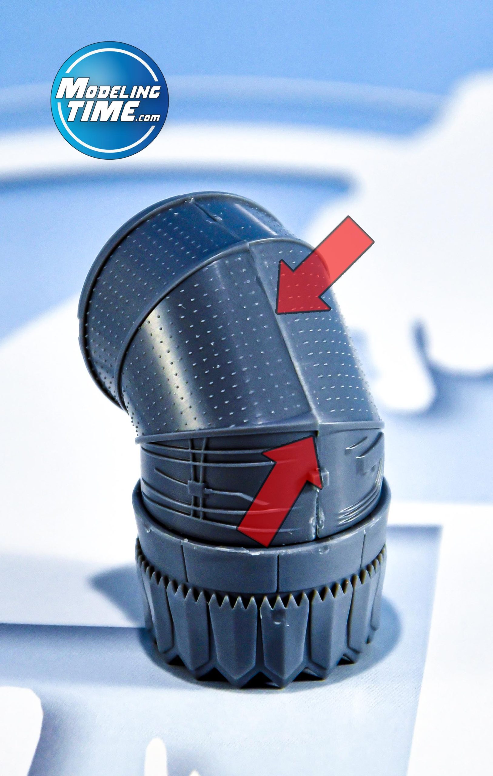 Oltre a quanto detto, si notano anche delle zone dove il dettaglio e le pannellature perdono di definizione e/o spessore; è il caso, ad esempio, di una delle bombe JDAM o del condotto del motore dove i bulloni in prossimità della linea di giunzione tendono ad appiattirsi. A proposito del condotto, l’accoppiamento delle due valve, nonostante l’allineamento dato dai pin di riscontro, è comunque molto impreciso (addirittura la centina dello snodo, indicata dalla freccia in rosso, non è continua tra le due parti) e questo costringe il modellista ad un tedioso lavoro di stuccatura e carteggiatura che, inevitabilmente, porterà ad una perdita dei particolari.