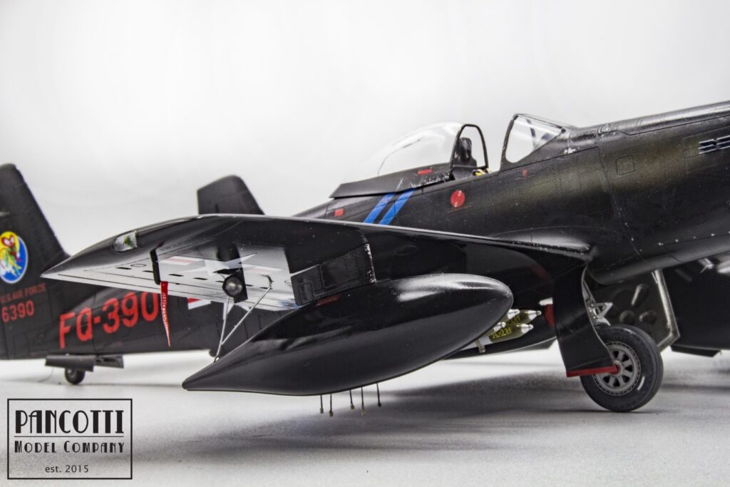Non era raro vedere degli F-82 equipaggiati con serbatoi in metallo naturale, pertanto ho deciso di riprodurre questa particolarità anche per il “Midnight Sinner”. Quello metallico è verniciato in Alclad White Aluminium ALC-106. Sull’altro, in nero lucido, ho riprodotto le scrostature circolari che si a formavano al contatto con il bocchettone di rifornimento (con una matita acquerellabile color argento).