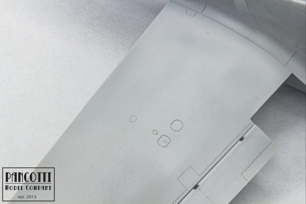 Per concludere gli interventi sulle ali, ho stuccato le pannellature principali e lasciato aperte quelle delle tipo e quelle a copertura degli attuatori e cerniere degli alettoni. È importante ricordare che anche i Twin Mustang, come i P-51 da cui derivavano, sfruttavano il flusso laminare; di conseguenza, anche l’ala degli F-82 era stuccata e raccordata con uno stucco all’alluminio. Allo scopo ho utilizzato il Mr. Surfacer 1200 della Gunze applicato con uno stuzzicadenti lungo le pannellature e ho rimosso l’eccesso strofinando con dei cotton fioc imbevuti di acetone per unghie.