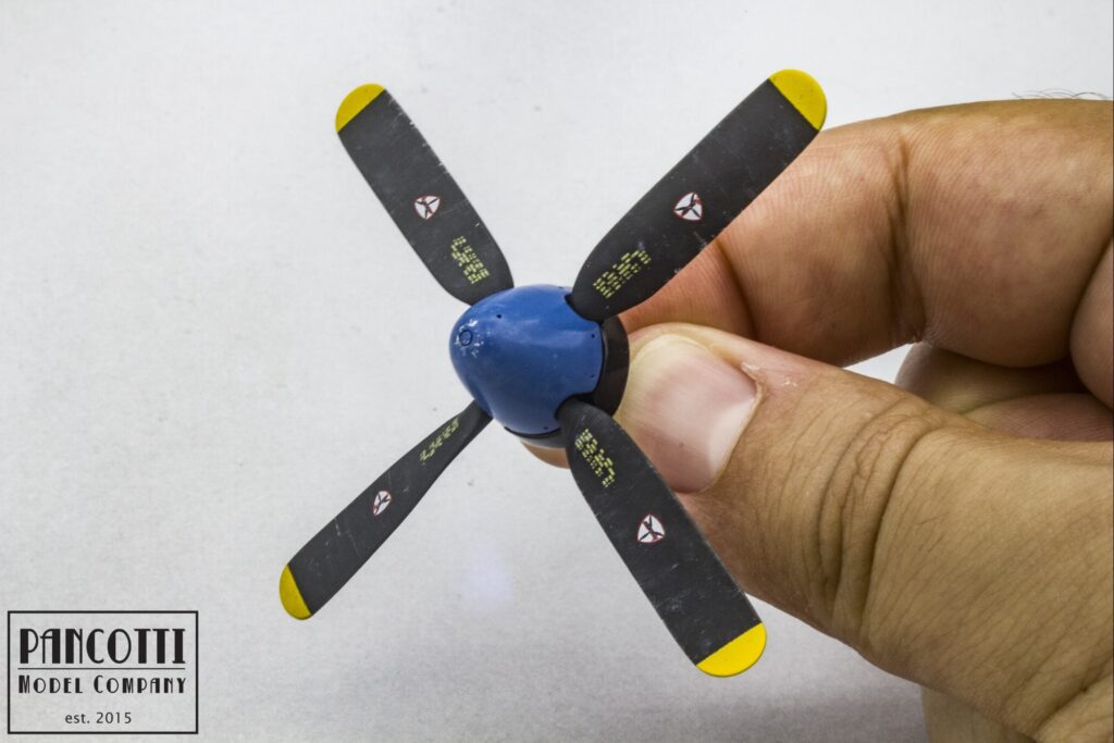 Le eliche ruotavano in senso contrapposto, tenetelo a mente quando le monterete sul vostro modello. Le pale sono verniciate in Gunze H-77 Tyre Black e invecchiate con colori ad olio a secco e spugnetta sporca di Alluminio Vallejo Air. Anche le ogive hanno ricevuto il medesimo trattamento.