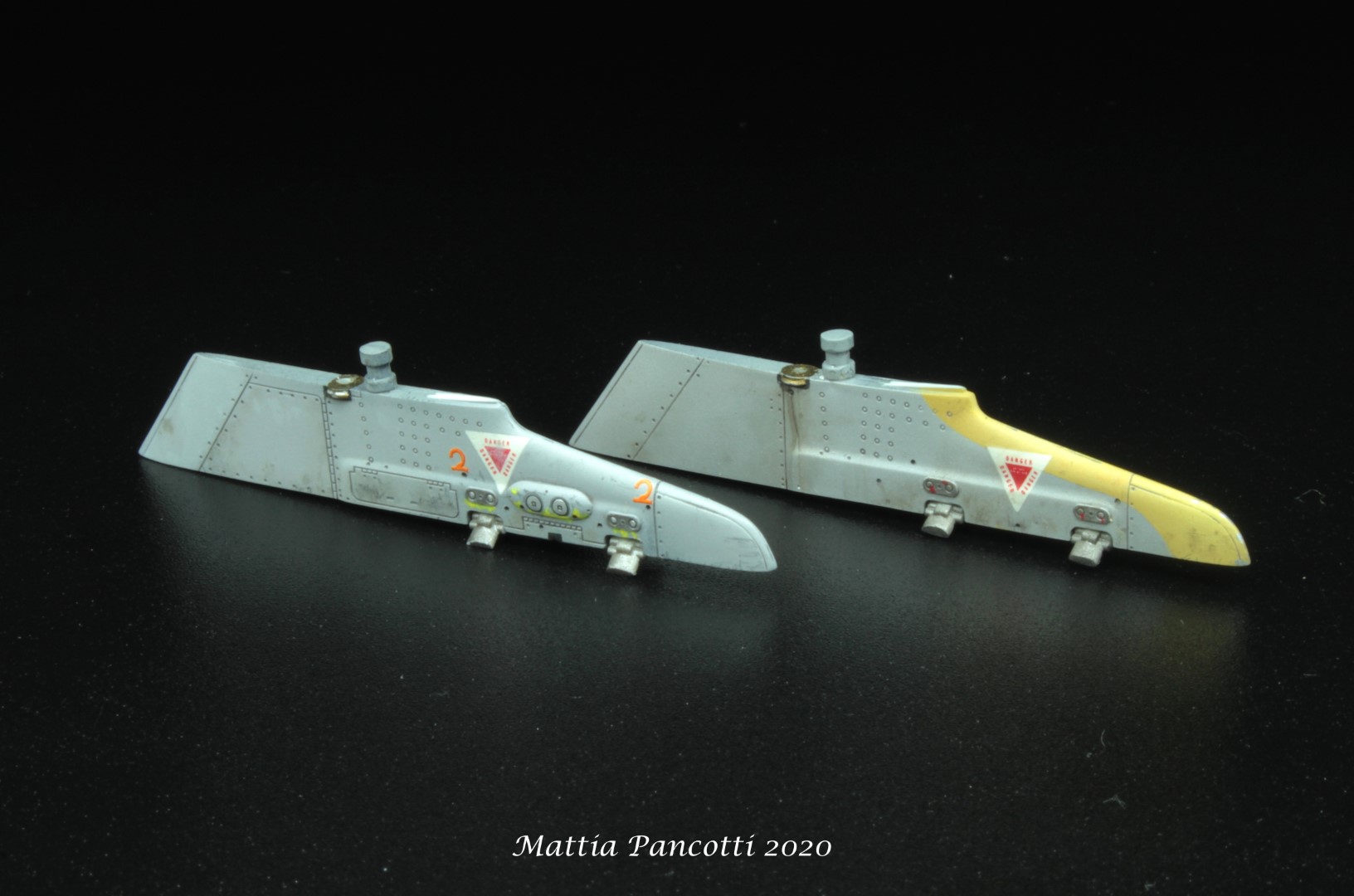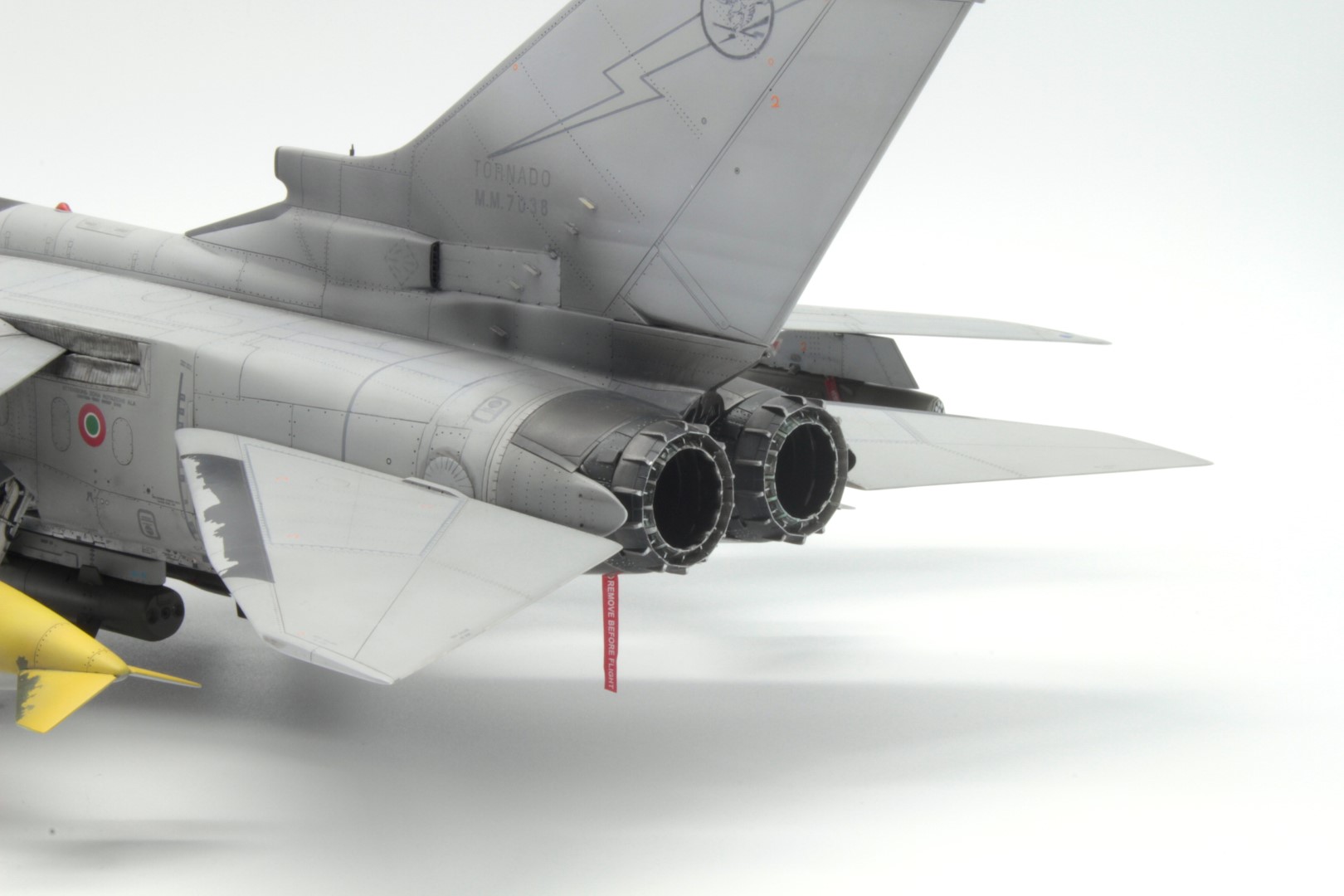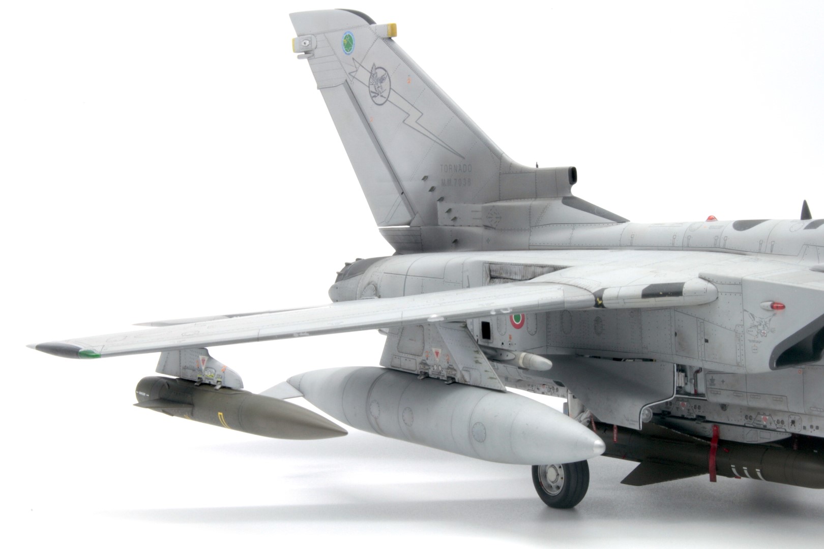 Grazie al confronto con Andrea, alias trachio001 sul forum di Modeling Time, mi è stato fatto notare come il pilone non fosse in due toni di grigio (erroneamente lo avevo interpretato così all’inizio), piuttosto che il secondo tono fosse l’alluminata della precedente mimetica standard NATO opacizzata al punto di sembrare un grigio molto chiaro. Questo spiega anche la presenza degli stencil ad alta visibilità, come i triangoli e i simboli arancioni, e il grigio nella parte anteriore che copre il verde scuro sottostante (non a caso le scrostature che si vedono nelle immagini rivelano la presenza della vernice più vecchia).