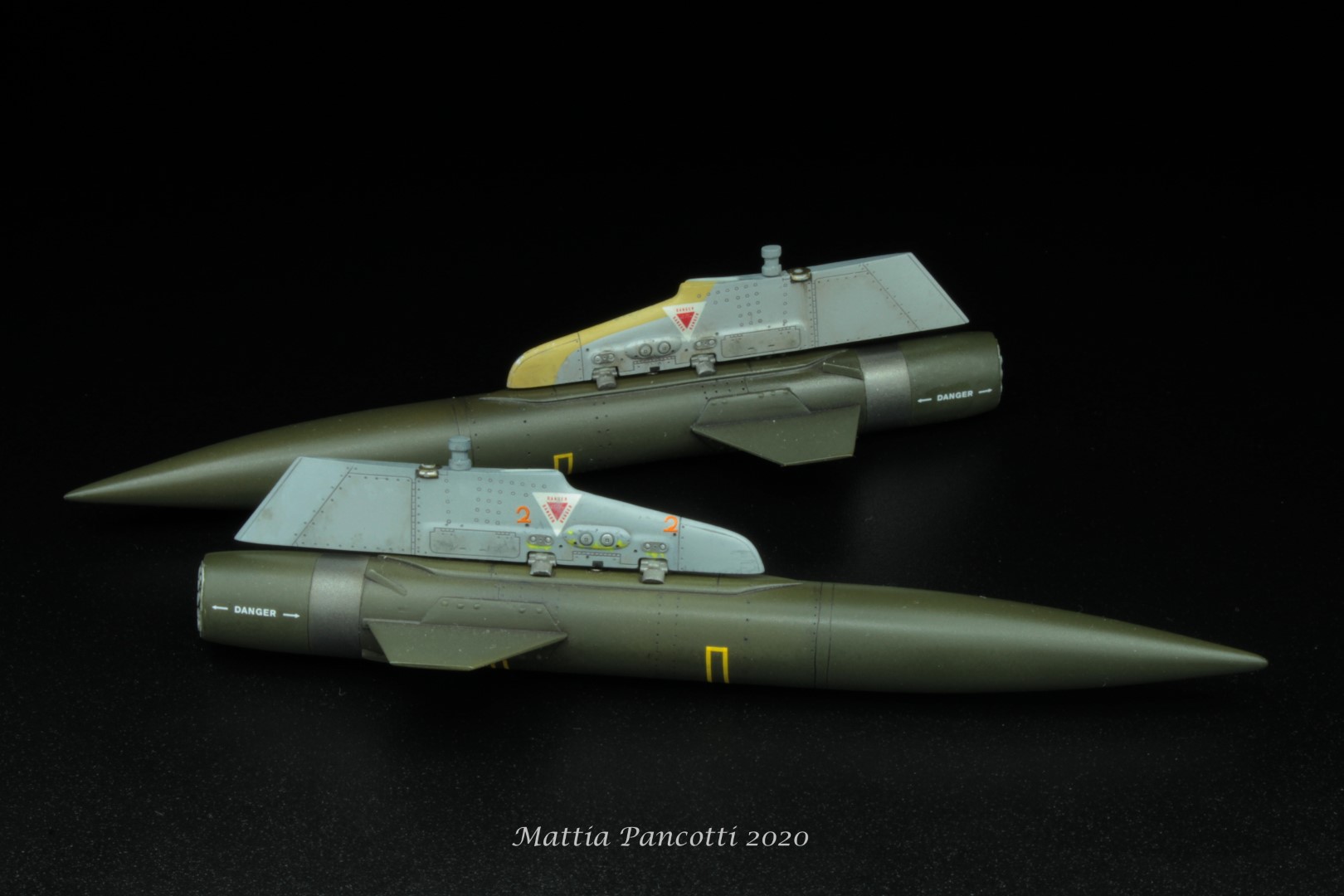 All’inizio sono rimasto entusiasta della qualità di questo aftermarket, complice il numero di parti stampate davvero bene e per la presenza di decal e accessori. Ma una volta terminati i missili ed eseguite le prove a secco di rito, ho tristemente scoperto che le alette erano più lunghe dei carrelli e toccavano il piano di appoggio. Inizialmente ho pensato a qualche mio errore di montaggio invece, a seguito di un confronto con la documentazione, ho capito che le ali anteriori dei missili sono assurdamente enormi. In basso un confronto tra il missile originale (sopra) e quello modificato (sotto):