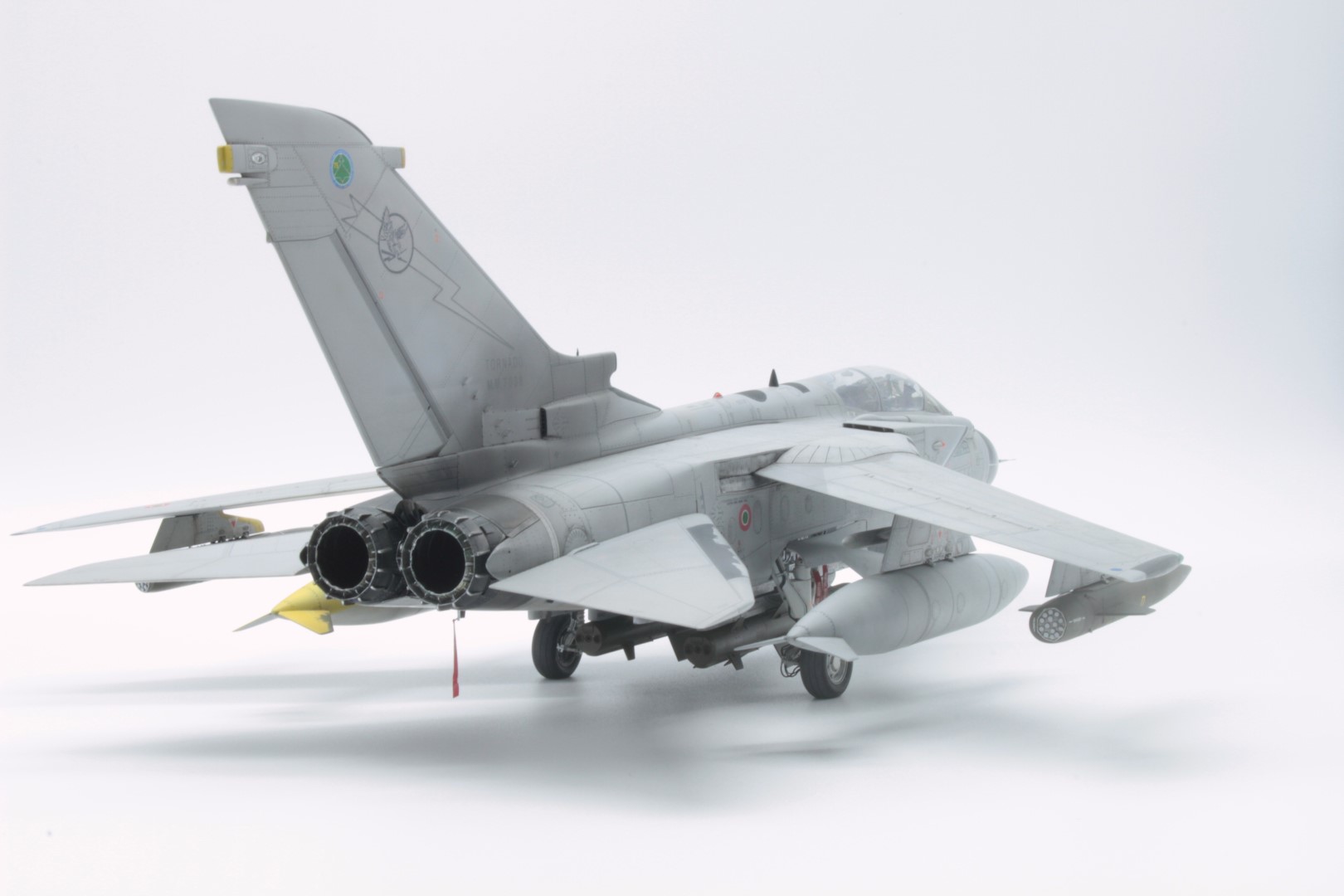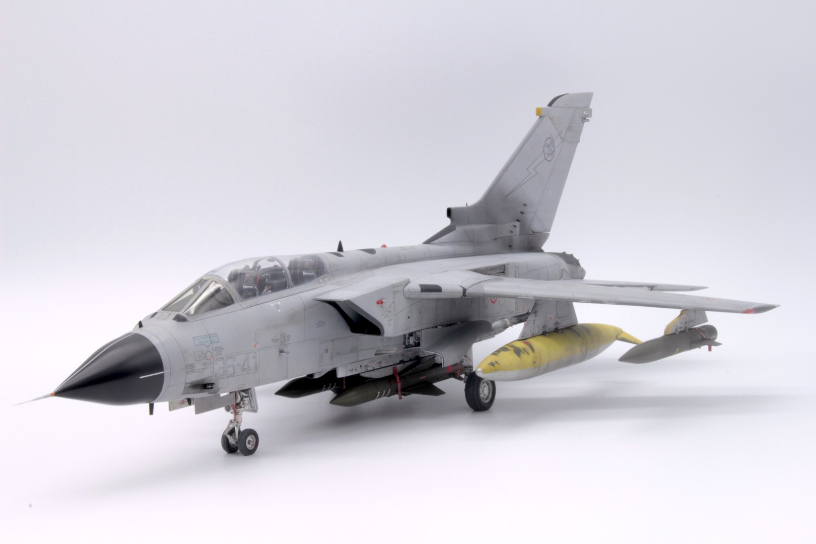 Ho deciso di realizzare uno dei piloni esterni in grigio, l’altro in alluminio e giallo sabbia (Alclad ALC-117 Dull Aluminium e giallo realizzato con un mix di Tamiya XF-59 e Tamiya XF-3 al 50%) proveniente da uno dei velivoli che parteciparono all’Operazione Locusta. Tale promiscuità di parti non era infrequente sui Tornado del 36° stormo e anche degli altri reparti dell’AM.