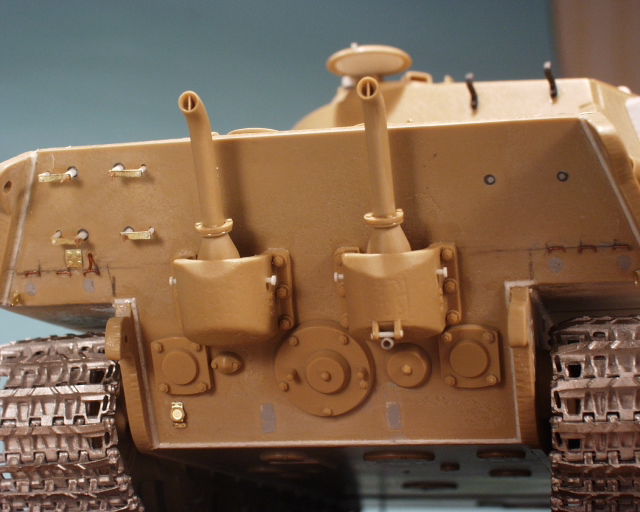 Ho, poi, riprodotto i punti di ancoraggio situati nella parete posteriore utilizzando dei tubicini di diverso diametro della Evergreen. Le cerniere di chiusura, invece, sono state riprodotte usando i dettagli fotoincisi della Aber e le viti a farfalla della Modelkasten. Ho completato le protezioni corazzate degli scappamenti con i gli anelli di sollevamento (due per ogni protezione) riprodotti con tondini Evergreen e dischi ricavati con il Punch and Die. Le protezioni sono poi state testurizzate con una fresa circolare montata sulla Dremel impostata a velocità ridotta. Ho poi aggiunto i numeri di fusione ma solo sulla protezione sinistra, come rivelato dalle foto del mezzo reale.