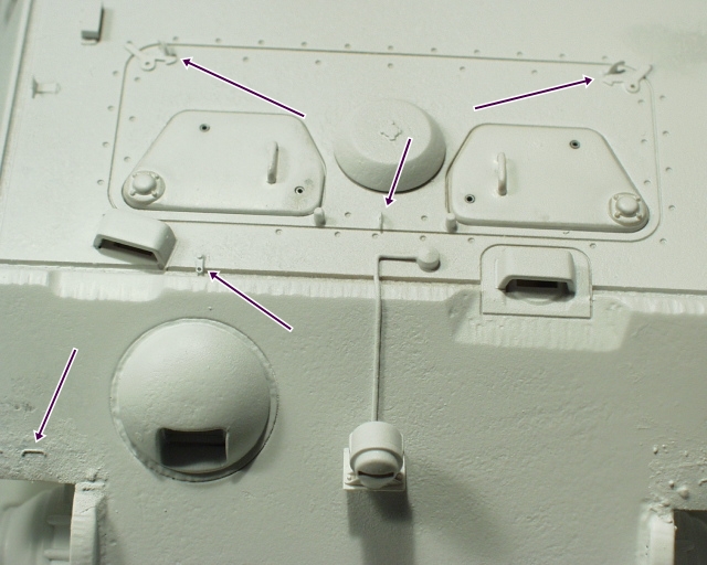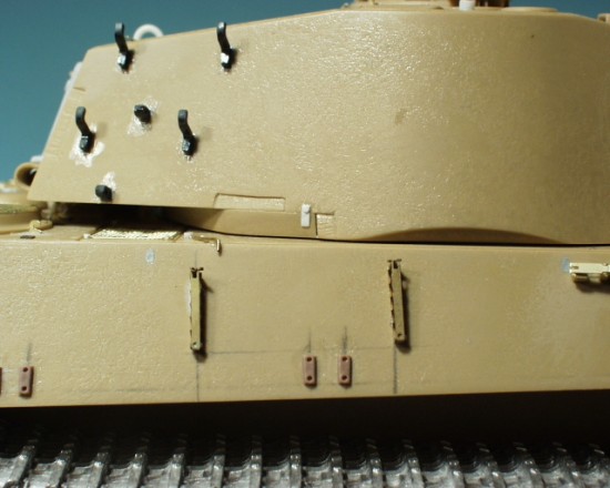La guida per il puntamento, situata di fronte alla cupola del capocarro, deve essere riposizionata e integrata con il dettaglio a forma di L. Nel settembre 1944 venne stabilito di aggiungere un elemento a forma di U rovesciata per prevenire infiltrazioni di acqua piovana o fastidiosi riflessi solari all’interno dell’apertura relativa al sistema di puntamento. In realtà questa modifica divenne operativa solo a partire da gennaio 1945. Per riprodurla ho incollato una striscia di metallo opportunamente sagomata.