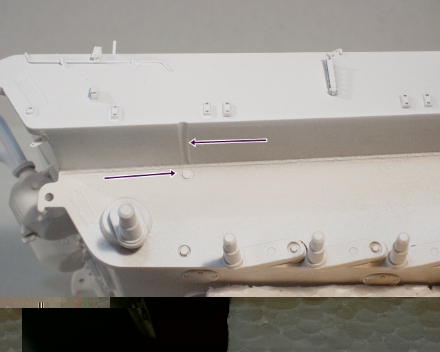 Prima di incollare gli agganci per le maglie dei cingoli di scorta (quattro per lato) (**) ho riprodotto l’effetto fusione anche sulla torre applicando lo stesso metodo utilizzato per il mantello del cannone, mentre l’effetto seghettato sul bordo delle piastre è stato realizzato utilizzando una fresa rettangolare montata sul trapanino fatto girare alla minima velocità. Alla fine ho aggiunto le saldature. Personalmente non uso il pirografo perché, a mio avviso, si ottiene un effetto completamente sbagliato e irrealistico; preferisco un diverso approccio incollando delle sottili striscie di plastica che poi vengono trattate con una fresa rotonda a bassa velocità; con la paglietta per i piatti ripulisco le striscie dai residui di plastica e ripasso le saldature con abbondanti pennellate di colla liquida ripetendo il passaggio con il trapanino. Il procedimento è stato ripetuto fino ad ottenere l’effetto desiderato. Le quattro depressioni circolari posizionate parallelamente alla piastra frontale (utilizzate per allineare le piatre tra di loro prima di procedere alla saldatura) hanno un diametro troppo ridotto e, quindi, vanno rifatte. Per migliorare l’effetto ho anzitutto allargato i buchi chiudendoli dall’interno con tubi di plasticard facendo attenzione a non posizionarli “a filo” ma lasciandoli leggermente incassati. Poi ho riempito le singole depressioni con stucco della Squadron. Inserendo uno stuzzicadenti tagliato con lo stesso diametro delle depressioni ho iniziato contemporaneamente a premere e ruotare lo stuzzicadenti in modo da creare un sottile bordo irregolare che simulava perfettamente i residui di fusione.