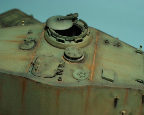 I due cardini del portello sono, invece, errati; quelli corretti erano più simili a quelli adottati per il Porsche Tiger II, così li ho ricostruiti. Intorno al portello ho aggiunti otto piccoli buchi; stesso procedimento ho adottato per i buchi intorno al Nahverteidigungswaffe. A partire da agosto 1944 la cupola del capocarro non era saldata ma imbullonata alla torre mediante sette grossi bulloni. Nel mezzo reale mancava, quindi, la saldatura intorno alla cupola mentre, invece, era presente una sottile linea che ho riprodotto “girando” attorno alla cupola con una lama X-Acto ben affilata. Nella cupola erano presenti, come per il Tiger Ie, due piccoli tubi che dovevano servire ad installare la copertura in tela contro la pioggia e/o il sole. Per riprodurli ho utilizzato due tubicini della Minimeca incollati simmetricamente l’uno all’altro; ho completato la cupola con il fermo situato “a ore 12” rispetto al periscopio.