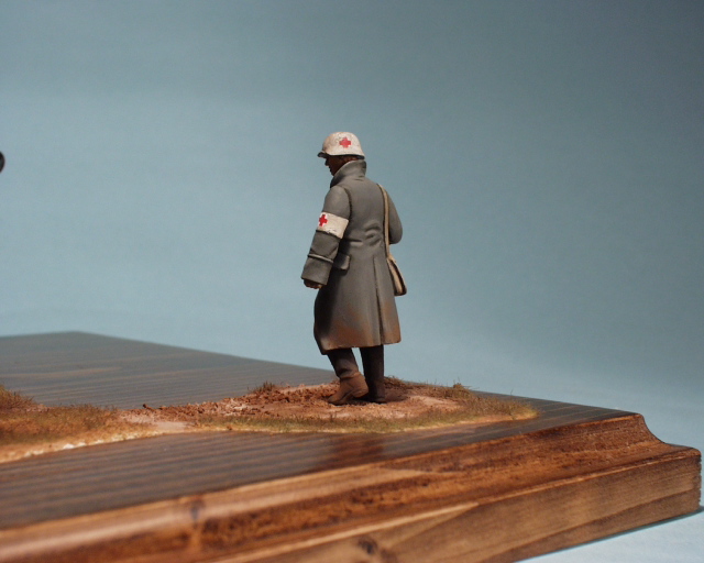 Il soldato è della ditta Wolf cui ho sostituito la testa con una prodotta dalla Hornet. Ho usato gli smalti della Humbrol per la divisa e gli olii per l’incarnato. Le croci rosse sull’elmetto e sul bracciale provengono da un vecchio foglio di trasferibili della Verlinden. Il figurino, posizionato nell’ambietazone quando la pasta Das era ancora morbida, esalta le impressionanti dimensioni del Koenigstiger rispetto a quello del soldato sottolineando il senso di pena e desolazione che pervade la scena: il soldato, senza apparenti emozioni, guarda il carro abbandonato e passa oltre. Chi è “L’ultimo tra i perduti?” Il soldato o il carro?