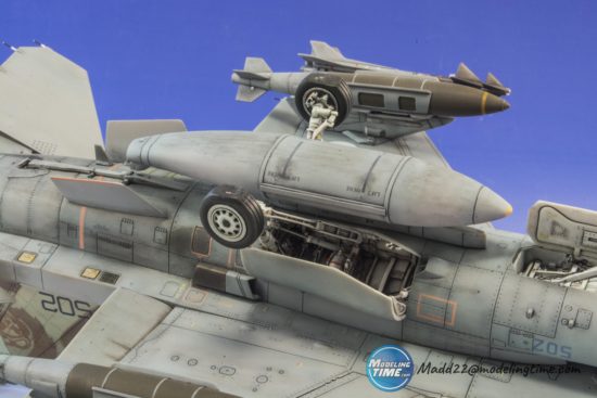 Per realizzare i Tornado in volo e in virata ho pensato ad una soluzione bizzarra, una scommessa (che per fortuna ho vinto!) per il buon esito finale del modello stesso: non sono un amante dei sostegni che entrano all’interno dei motori quindi ho deciso che i miei si sarebbero sorretti dalla pancia, appena dietro la grossa scritta “311° Gruppo Volo”.