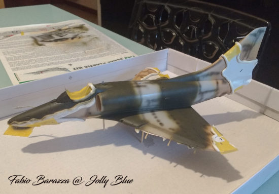 Ho incollato gli aerofreni in posizione chiusa (come normalmente sono al parcheggio) e chiuso i due airscoop ai lati della fusoliera che non sono pertinenti con la mia versione (ho usato il Green Putty della Squadron). Successivamente mi sono dedicato ai bordi d’attacco delle prese d’aria: i loro incastri non sono molto accurati e ho dovuto eseguire le solite e fondamentali prove a secco per adattarli al meglio. In questo modo ho potuto verniciarli preventivamente con il colore della mimetica, per poi incollarli e non toccarli più fino alla fine dei lavori. Mi sono anche risparmiato una tediosa mascheratura del bianco interno dato che esso cade giusto nel punto di attacco dei pezzi sopracitati!
