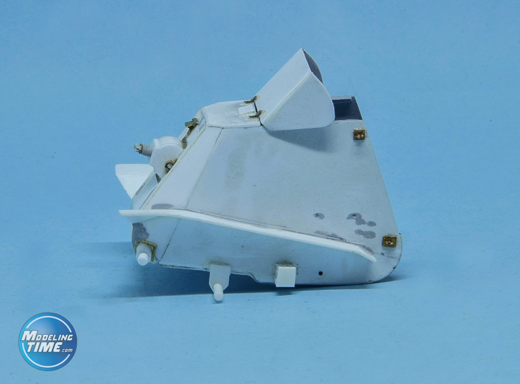 Sulle zone del carapace, delle alette Krueger sul bordo d’attacco e le guaine che coprono il sistema di ripiegamento delle ali i dettagli o sono appena abbozzati, o del tutto assenti. In particolare le guaine le ho ricostruite armandomi di Plasticard da 0.75mm e pazienza… tanta pazienza!