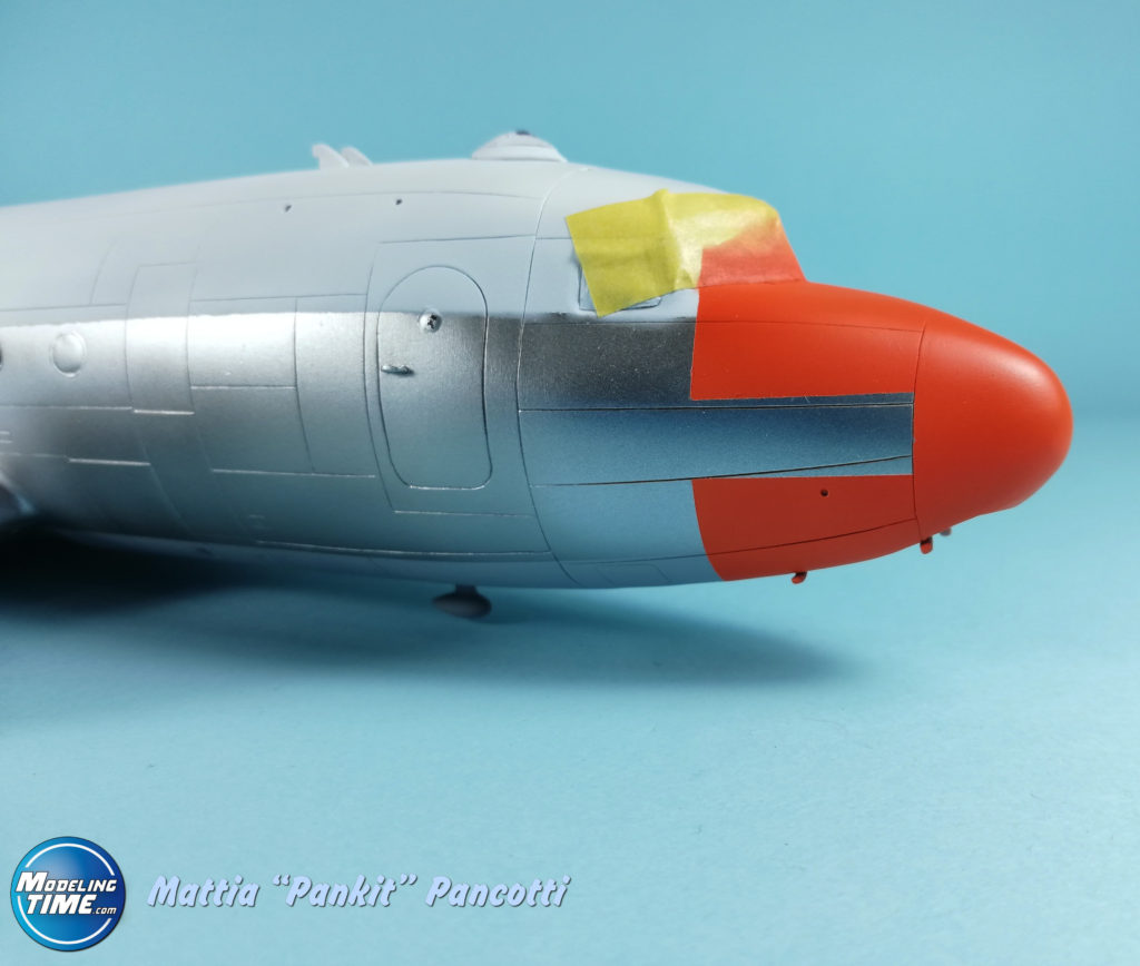 Ho utilizzato il nastro rosa della Tesa molto scarico per delimitare la zona da rifinire Italian Modern Sky Gray prodotto dalla Mr. Paint col codice MRP-095. Lo stesso colore l’ho utilizzato anche per verniciare le due guaine dove si ripiegano le ali.