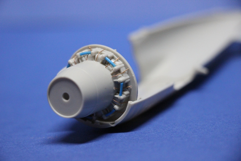 Sugli anelli che si raccordano alla fusoliera ho utilizzato, in parte, gli stessi accorgimenti ma aggiungendo, nel contempo, una “fascia” blu al centro realizzata con il Trasparent Blue della Alcad aerografato direttamente sopra il Dark Alluminium.