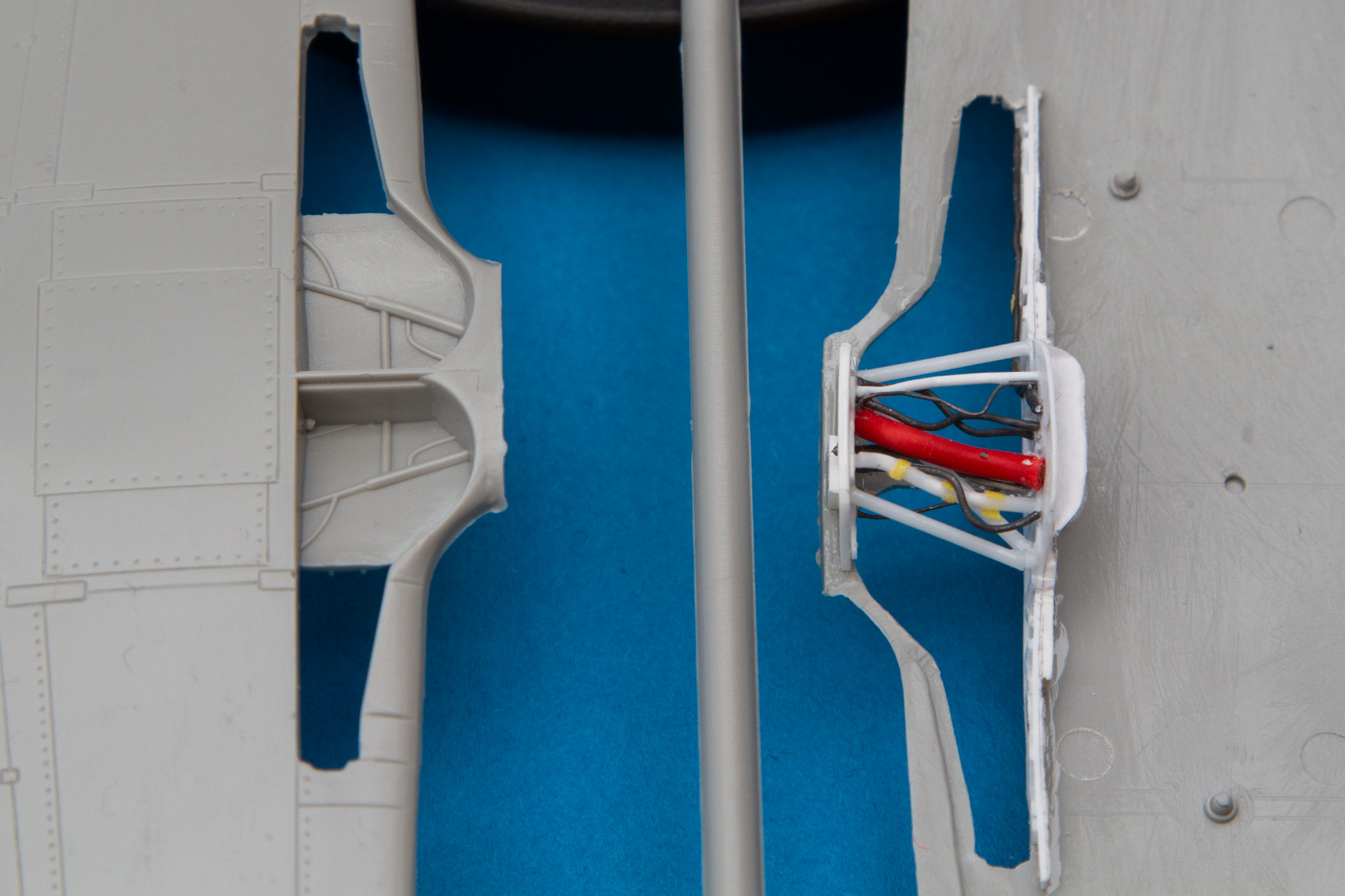 La scomposizione è infelice (anche perché l’80% dello stampo è in comune con la versione biposto) costringendo a numerose prove a secco e a un uso intensivo di stucco (nel mio caso ho usato, come sempre, la colla ciano acrilica); necessari anche degli inserti di Plasticard per riempire le tante fessure che inevitabilmente si formano.