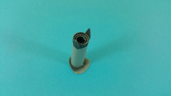 Ho, poi, aggiunto il “collare” di rinforzo riprodotto utilizzando il nastro d’alluminio adesivo (tagliato con la taglierina circolare OLFA). È doveroso, da parte mia, ricordare che il fuel tank è più corto di quasi un centimetro e andrebbe allungato con una sezione di medesima misura dal centro. Dal canto mio ho preferito tralasciare questa modifica sapendo che, a modello ultimato, il difetto non si nota poi tanto.