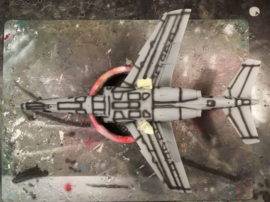 Dopo tante fatiche, finalmente, la fase di verniciatura è arrivata! Essa si è aperta con il pre shading, in nero, eseguito su tutte le pannellature. Sulle superfici inferiori, inoltre, ho aggiunto degli spot di Olive Drab XF-62 Tamiya che sotto al grigio simulano molto bene tracce di olio e fluidi idraulici.