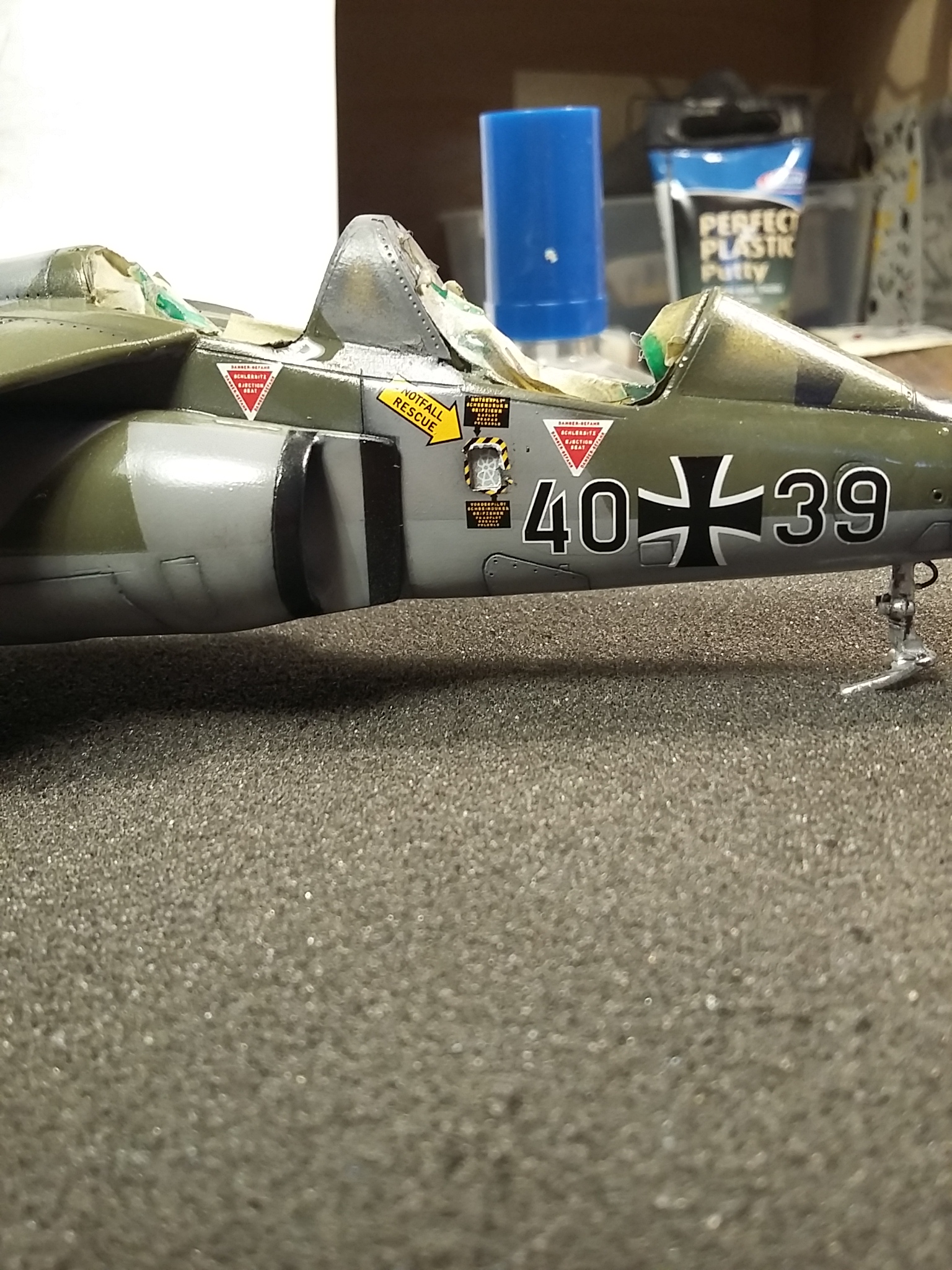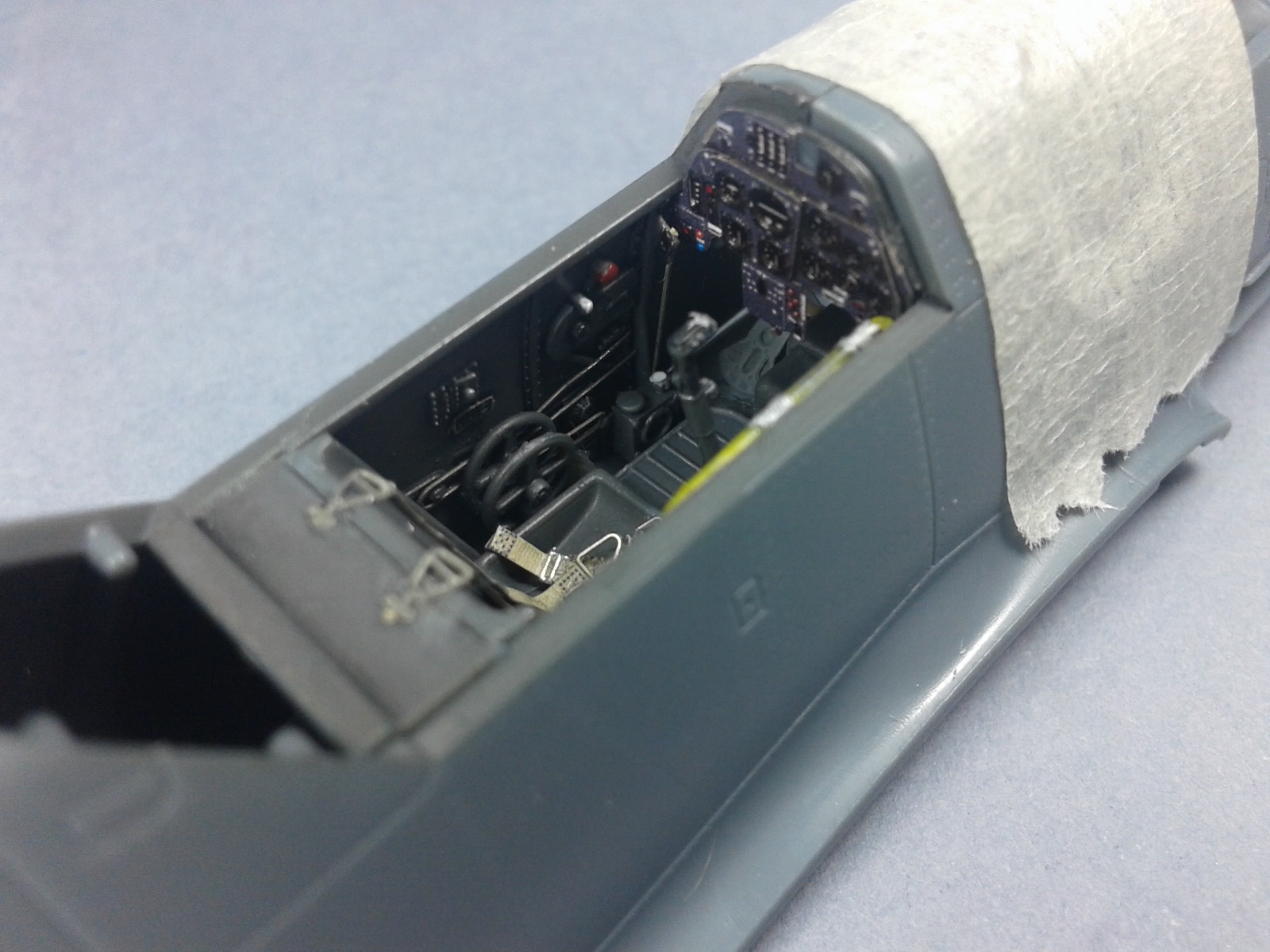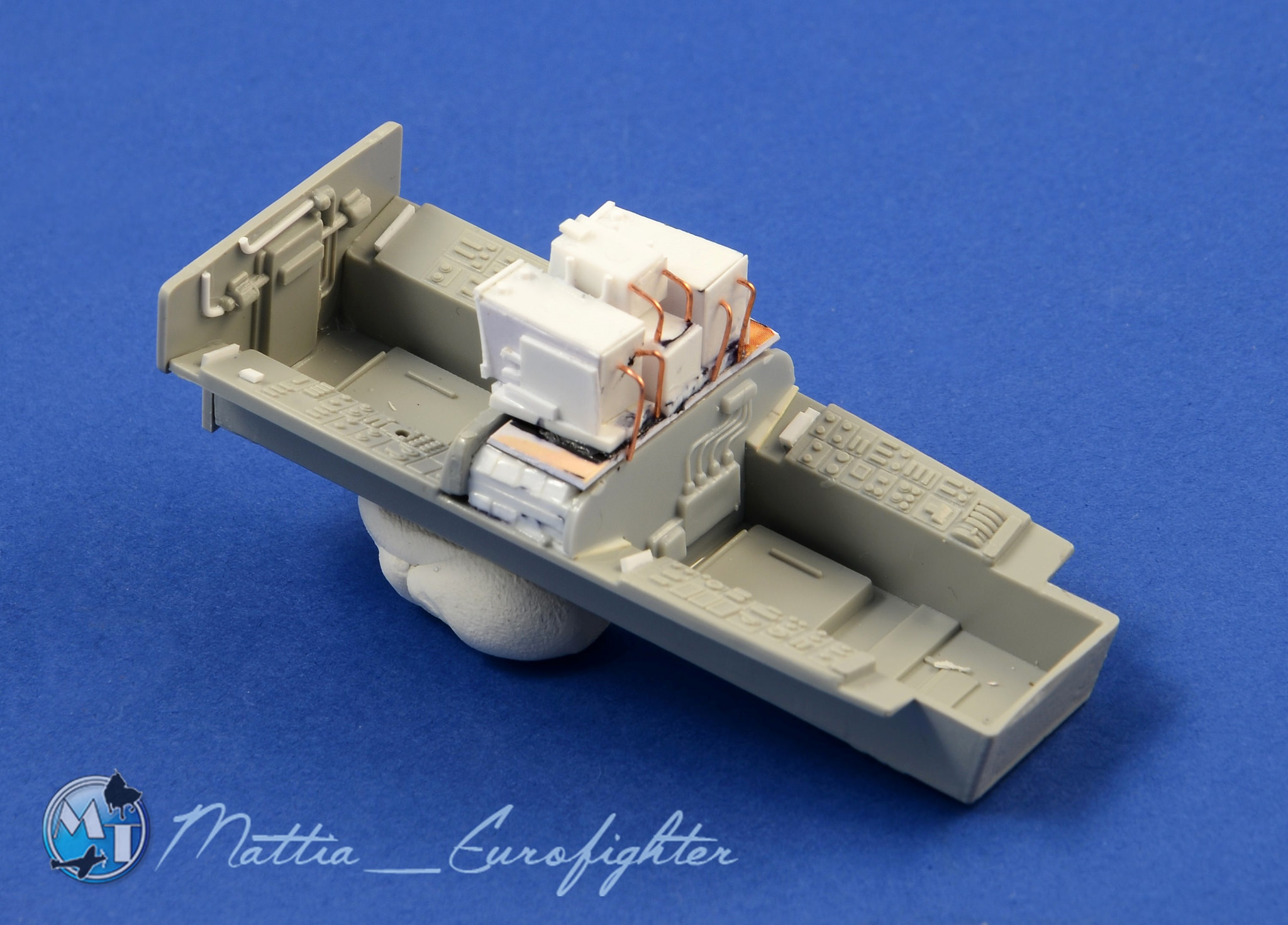 Ho aggiunto un paio di targhette in decal sul poggiatesta (provengono dal set della Mike Grant’s Decal) e le maniglie di espulsione fotoincise (di forma neanche troppo corretta) dal set Eduard. Sempre in fotoincisione sono anche le due “cinghie” di ritenuta delle gambe in basso. Vedendo le foto reali ho notato che queste “fasce semi rigide” vengono distese e lasciate dritte dal pilota prima di abbandonare il velivolo… per il volo successivo, poi, vengono “arrotolate” nuovamente intorno agli arti inferiori.